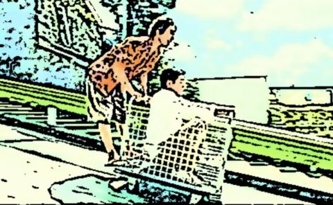 電車が向かって来た時、青山はふらついてホームに落ちそうになります。